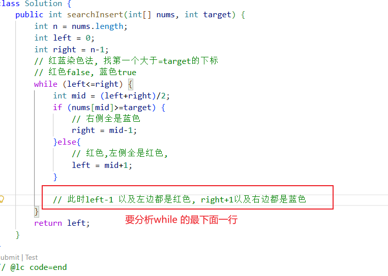 nums[mid]是target或target右侧,染成蓝色;其余染成红色。