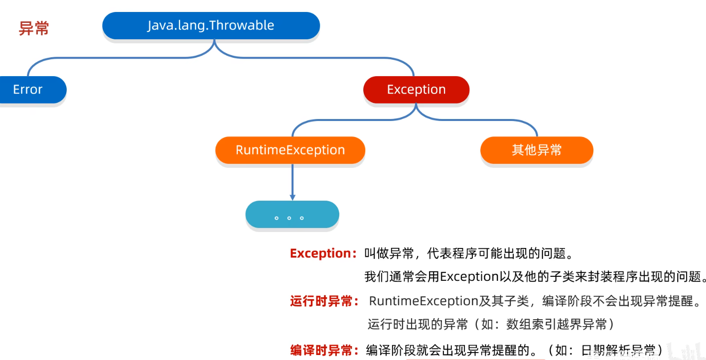 Java Java 异常处理 Java 异常处理 编译时异常必须要在代码中手动处理, 否则报错. 在于提醒程序员提前解决 异常处理 Jvm 默认会输出到控制台, 程序不会往下执行 自己处理 父类要写在下面 异常函数 交给调用者处理 自定义异常