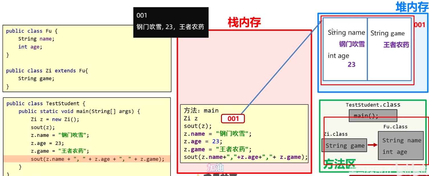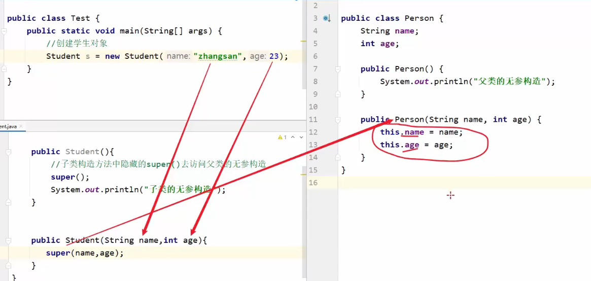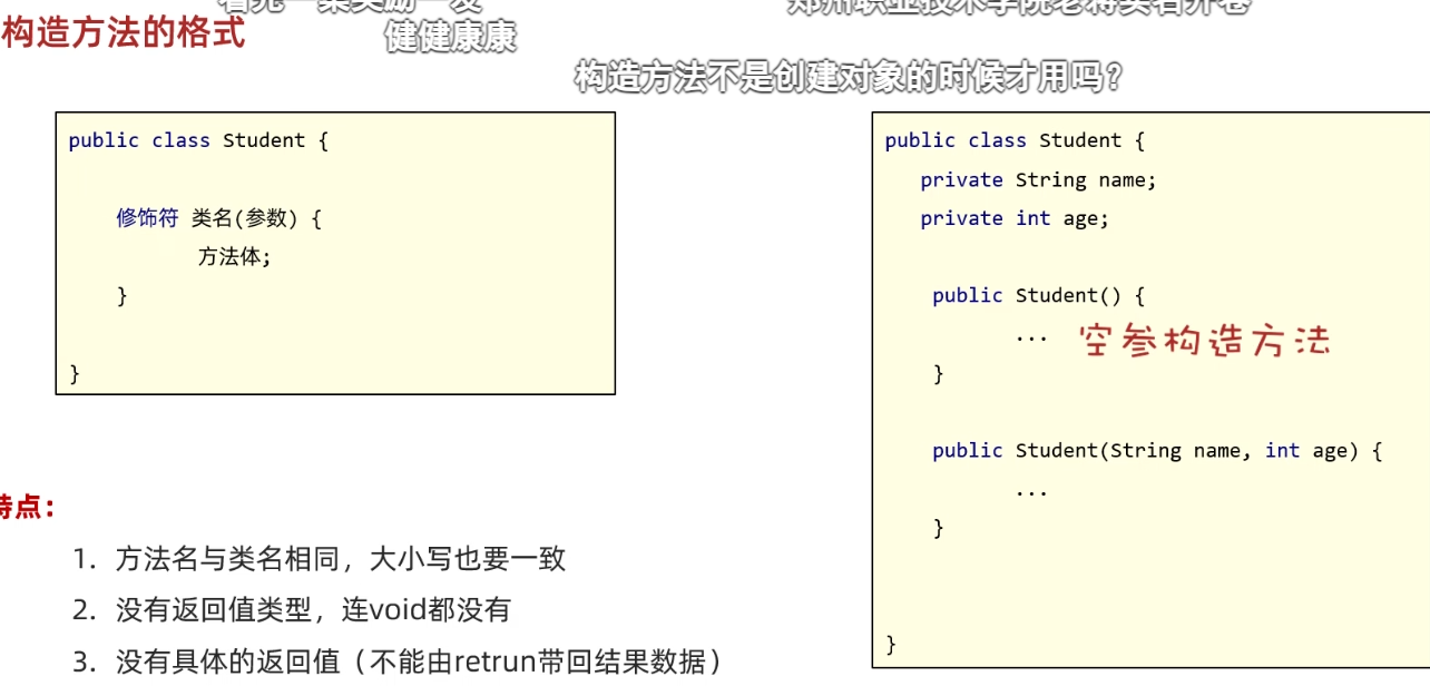 - 系统默认创建无参构造, 自定义有参或无参的构造方法后, 虚拟机不会创建无参构造.