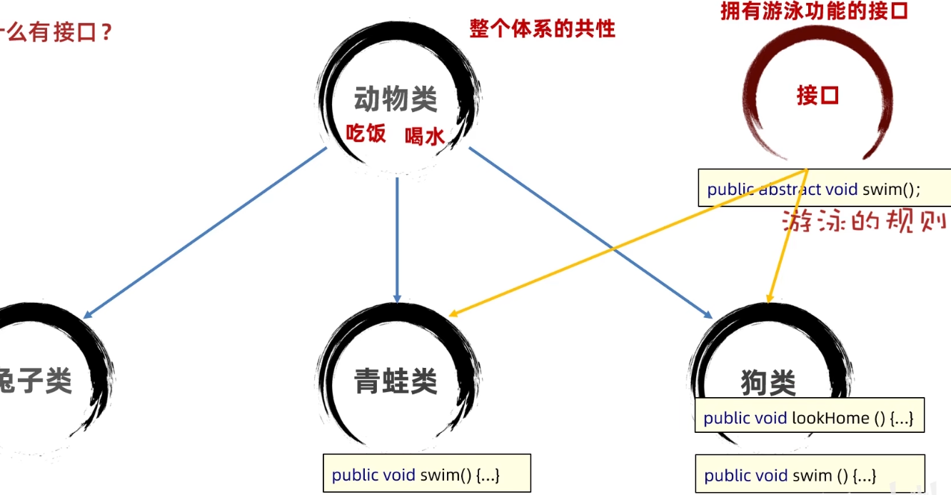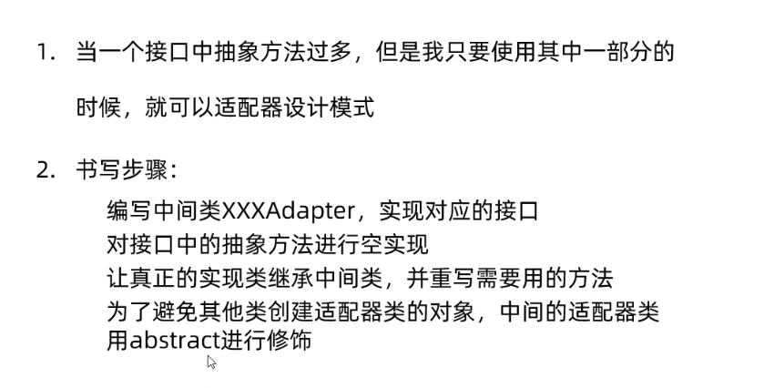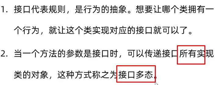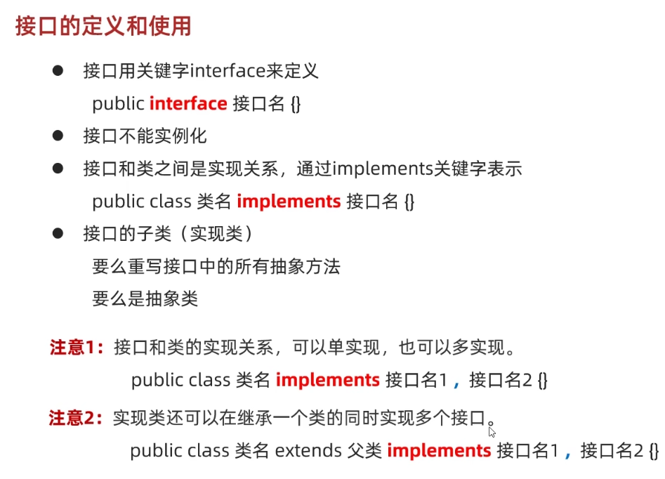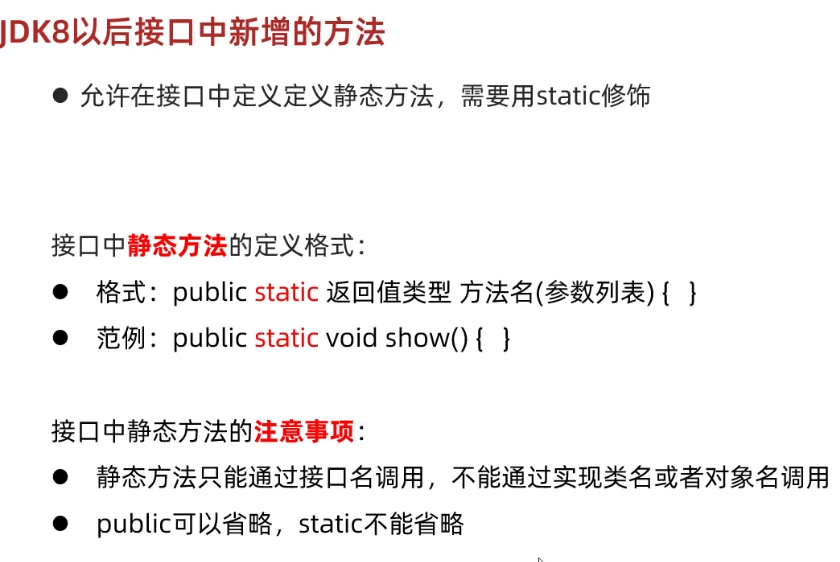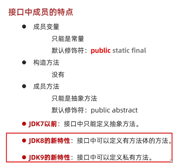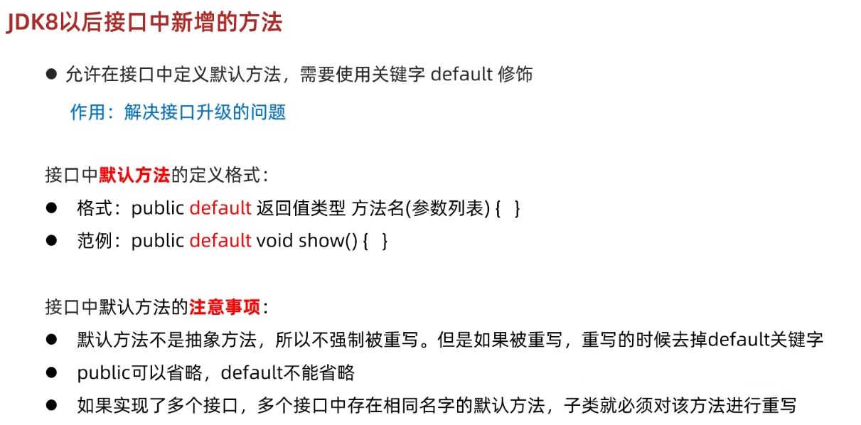 - 接口中可以有方法体, 在接口升级中可以防止报错; 接口中增加10个新函数, 添加