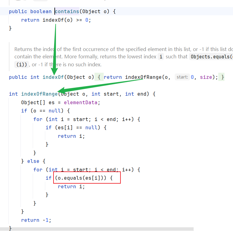 contains方法依赖equals实现比较, 如果数组是自定义类型且没有实现equals方法, 则默认使用Object.equals