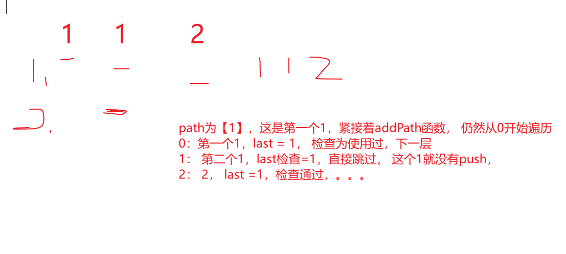 这里的重复是 for 循环的重复,可以参考[组合总和2](LeetCode 40 组合总和 II - 回溯解法.md) 去重,设置 last 变量记录上一次的值(这就要求排序使相邻元素在一起)。