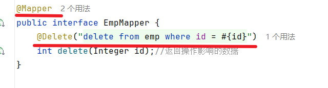 @Delete("delete from emp where id = #{id}") // 这个是站位, 不会sql注入问题