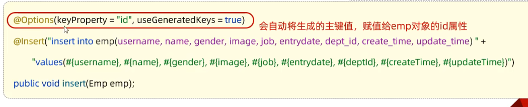 @Insert("insert into emp(username, name, gender, image, job, entrydate, dept_id, create_time, update_time) "+