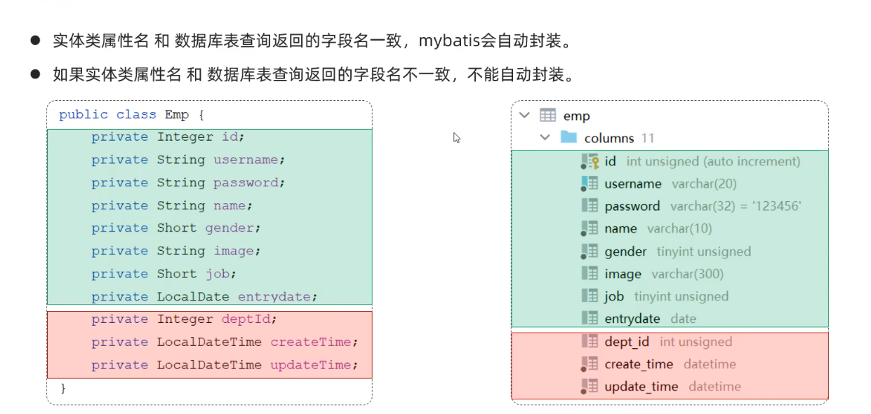 @Select("select id, username, password, name, gender, image, job, entrydate, dept_id deptId, create_time createTime, update_time updateTime from emp where id= #{id}")