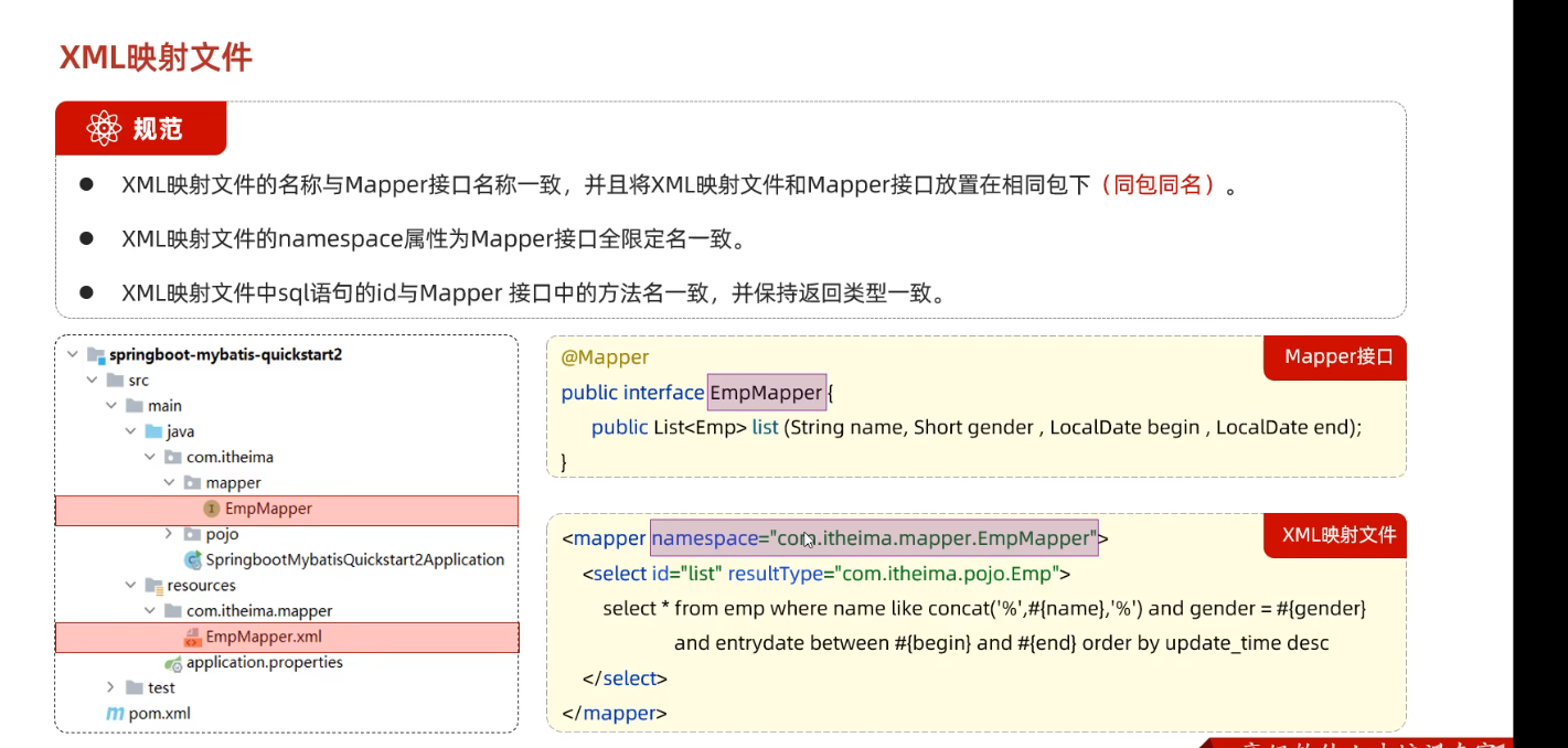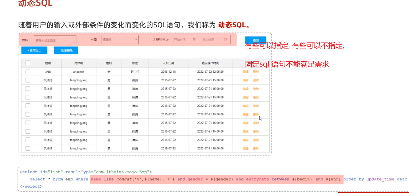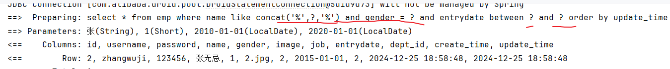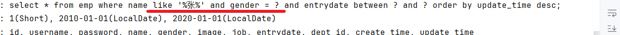 @Select("select * from emp where name like concat('%',#{name},'%') and gender = #{gender} and entrydate " +