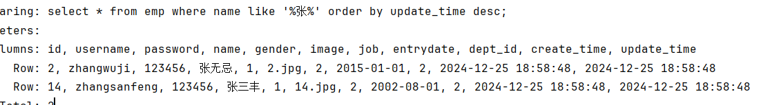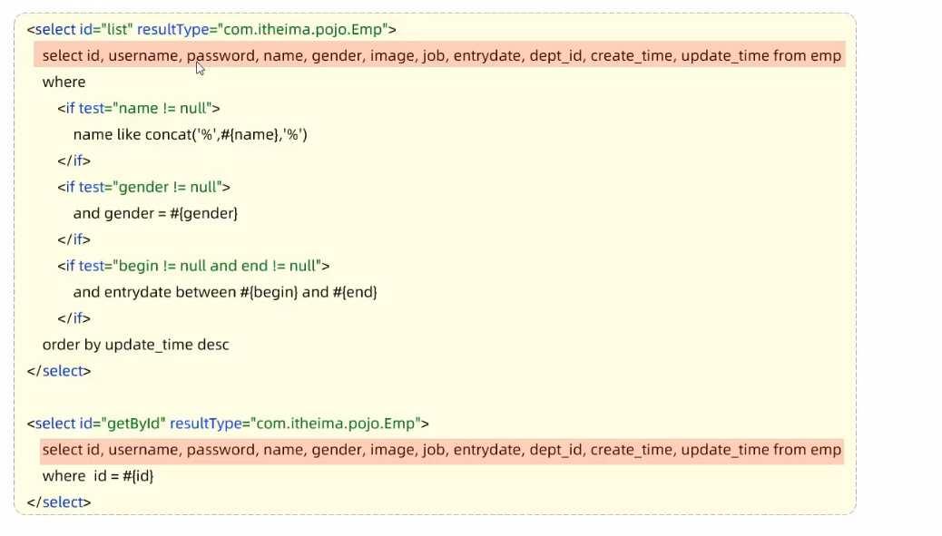 select id, username, password, name, gender, image, job, entrydate, dept_id, create_time, update_time from emp</sql>
