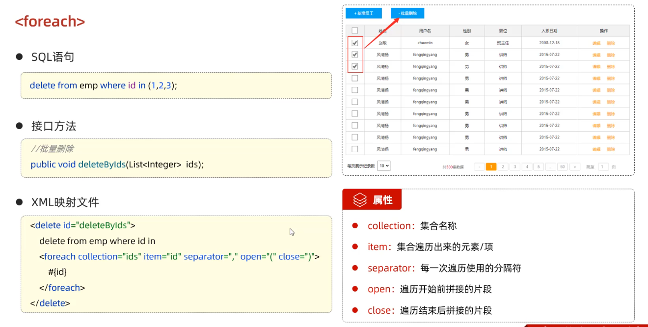 delete from emp where id in <foreach collection="ids" item = "id" separator="," open = "(" close = ")">