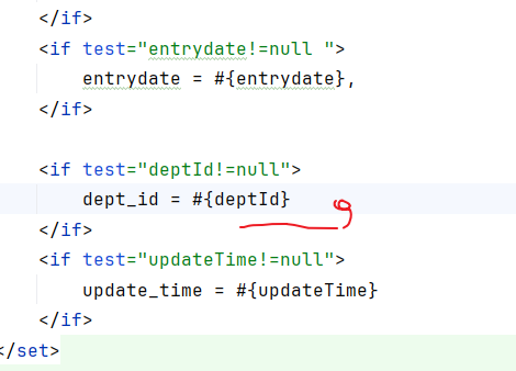 <if test="deptId!=null">dept_id = #{deptId},</if>
