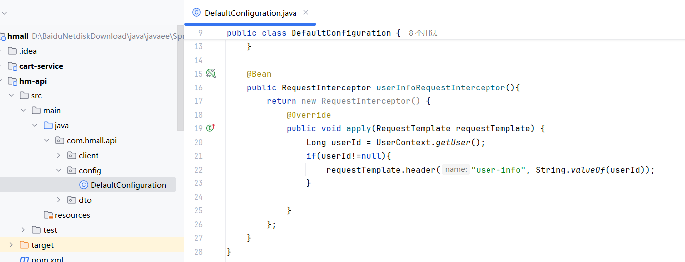 在cart-service中,定义一个新的接口,编写Feign客户端: