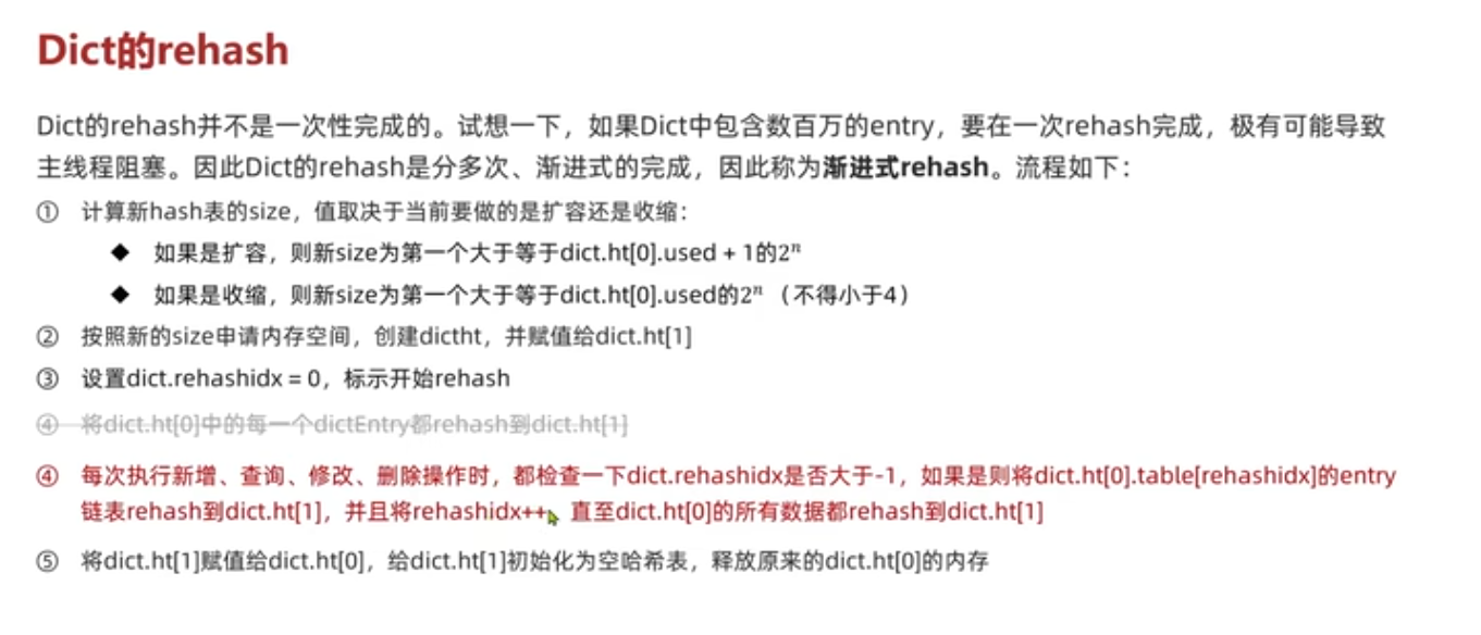 - 问题: 主线程在增删的时候会进行检查, 可能会进行rehash, 当数据很多时reahash可能会导致主线程长时间卡死, 因此rehash是多次. 渐进式完成的.