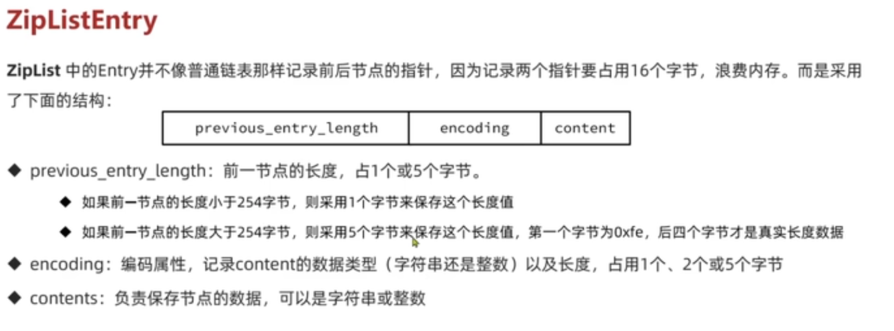 ZipList 中的Entry并不像普通链表那样记录前后节点的指针,因为记录两个指针要占用16个字节,浪费内存。而是采用了下面的结构: