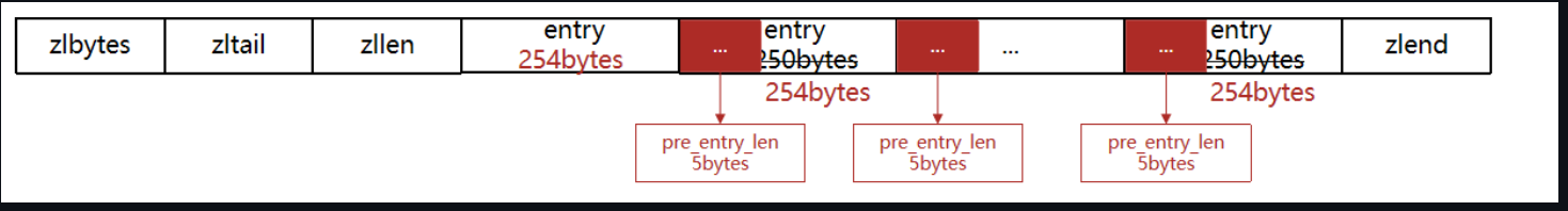 - 如果前一节点的长度大于254字节,则采用5个字节来保存这个长度值,第一个字节为0xfe,后四个字节才是真实长度数据