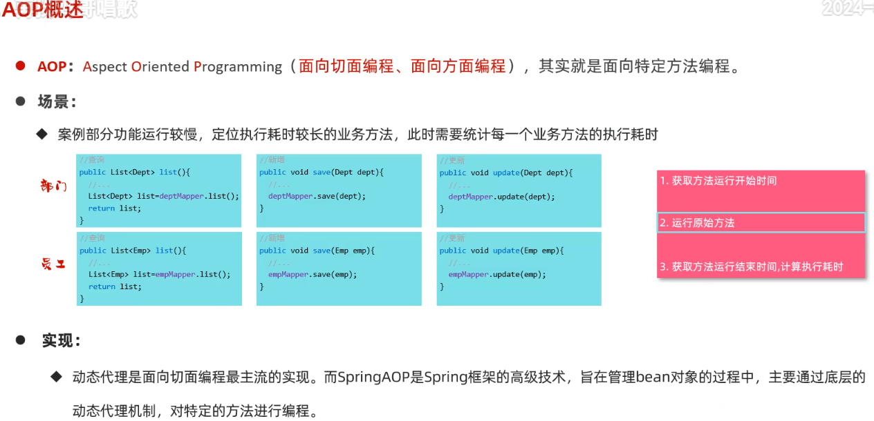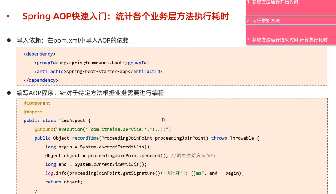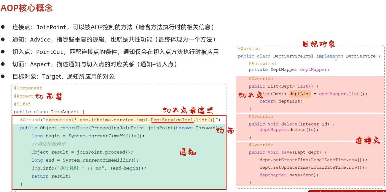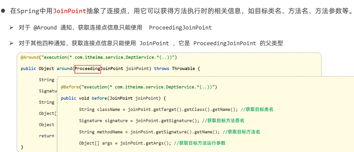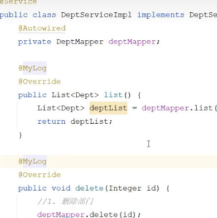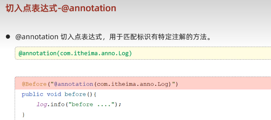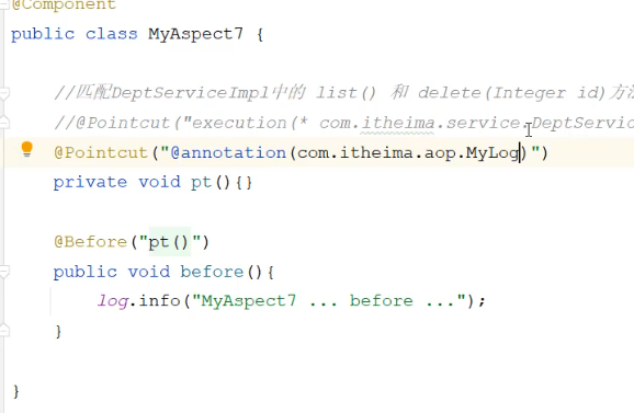 @Before("@annotation(autoFill)" )中填入注解形参的名字, 函数第二个参数设置log注解即可;@Slf4j @Component @Aspect public class AutoFillAspect { /** * 切入点 */ @Pointcut("@annotation(com.sky.annotation.AutoFill)") public void pt(){}; @Before("@annotation(autoFill)" ) public void AutoFill(JoinPoint joinPoint,AutoFill autoFill) throws NoSuchMethodException, InvocationTargetException, IllegalAccessException { log.info("开始执行公共字段填充"); //拦截mapper方法 update操作 只用 updateTime updateUser 赋值即可 // 获取方法的参数实体对象 OperationType operationType = autoFill.value(); log.info("获取到传入value:{}",operationType);