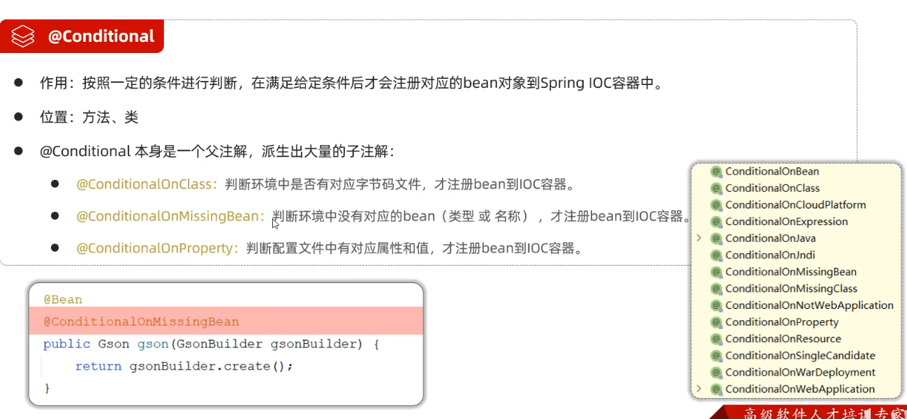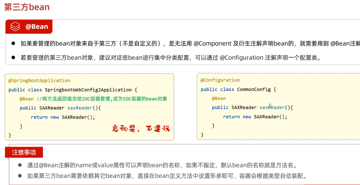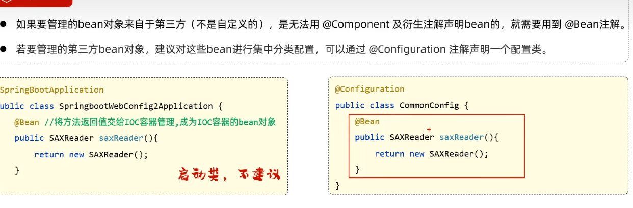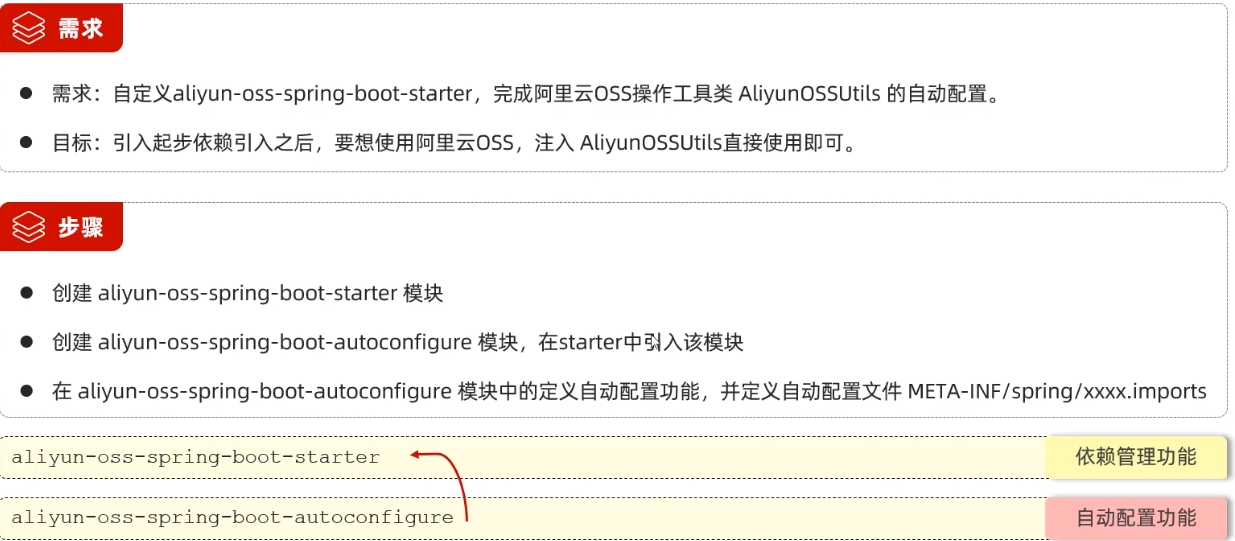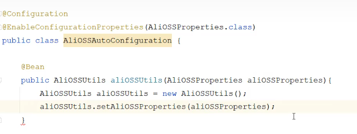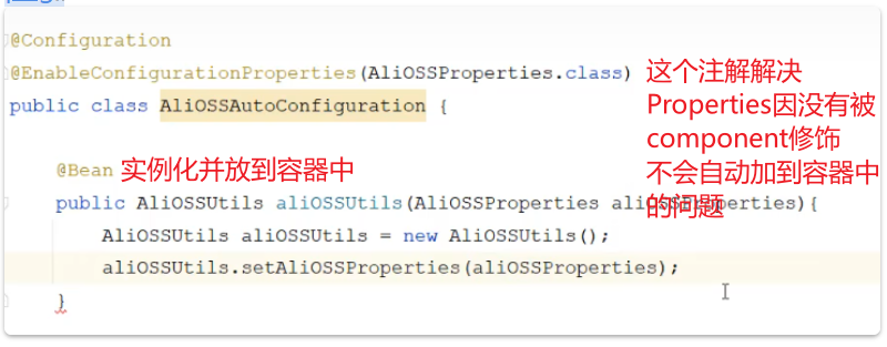 autoconfiguration中新建java文件AliOssProperties, AliOssutils AliOssProperties负责将配置中的字段加载到容器中, 但是AliOssProperties类不加@Component注解(即使加了也不会扫描到), 因此这个类不会自动加载到容器中AliOssUtils通过AliOssProperties的参数创建连接上传文件AliOssProperties没有在容器中, 因此需要设置自动配置类(简单讲它负责从容器中拿到properties并实例化Utils并将Utils放到容器中, 在使用时只需注入即可 )AliOssAutoConfiguration负责从容器中获取AliOssProperties并实例化AliOssUtils放到容器中