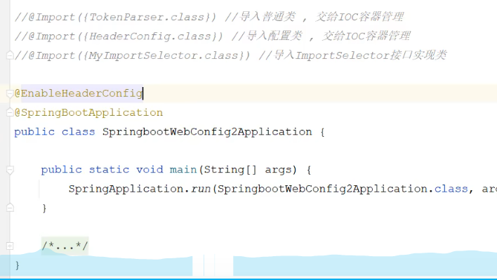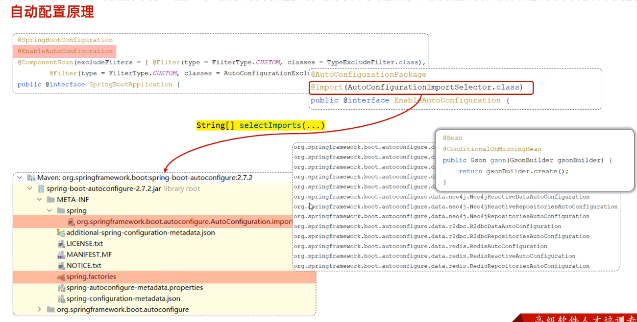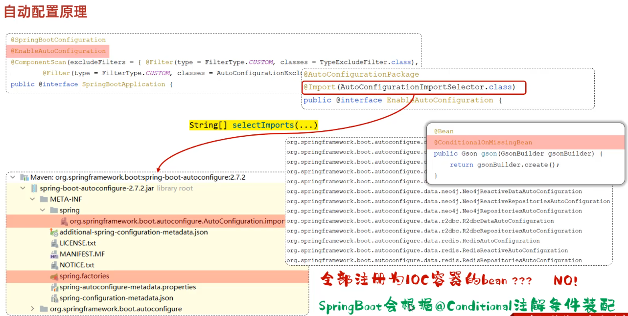 springboot -> @SpringBootApplication->@EnableAutoConfiguration->@Import({AutoConfigurationImportSelector.class})->selectImports()得到 spring/org.springframework.boot.autoconfigure.AutoConfiguration.imports 配置类后自动加载