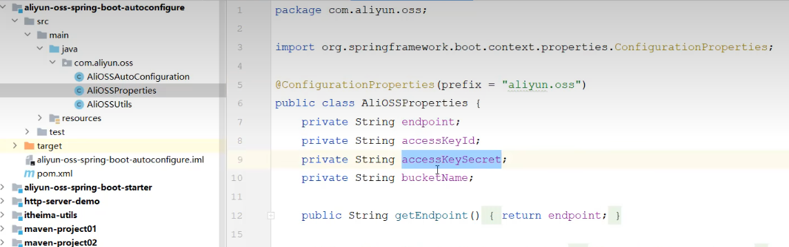 - aliyunproperties 是自动获取参数的, 需要在自动配置类上天剑enable注解才不报错(@configurationProperties报错)